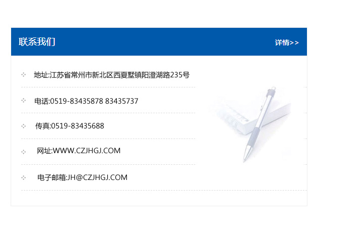 地址:常州市新北區友邦商務大廈1幢16、17層  電話:0519-85101652  傳真:0519-85112595  郵編:213022  網址:www.cz-jiayue_cn.shdbsl.com  郵箱:xiajifengaa@163.com